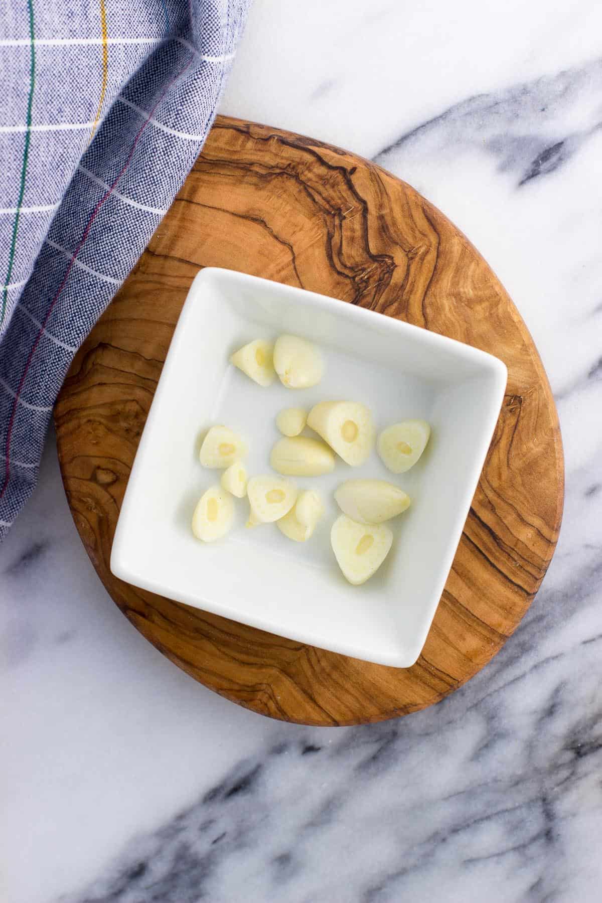 Keeping the inner layer of skin on the garlic allows the oil to remain covering the cloves as it roasts. It also offers a layer of protection against the garlic from burning during its extended (forty minutes or longer) time in the oven.