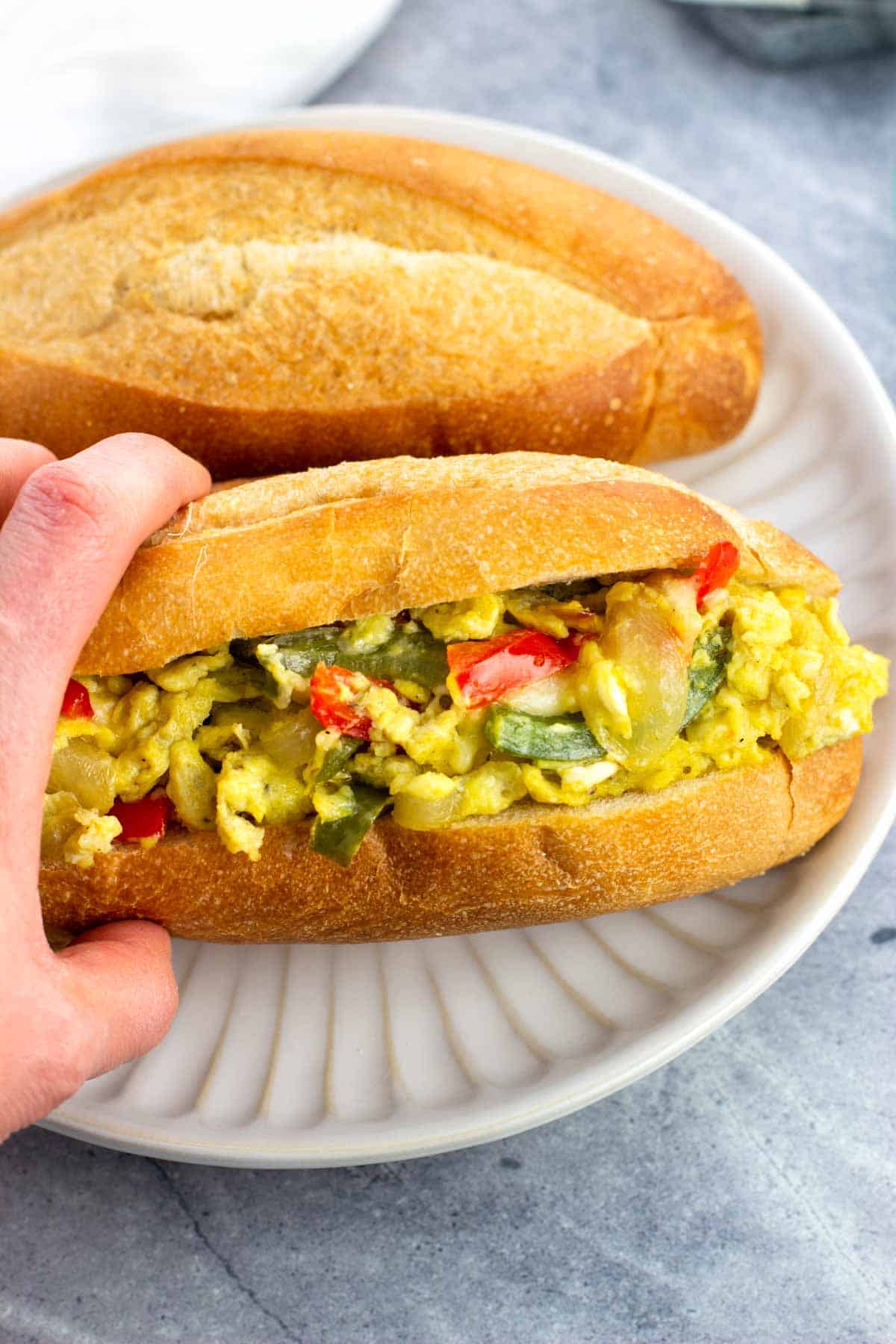 Sautéed peppers and fluffy eggs are cooked in plenty of olive oil, combined with Italian cheeses, and piled onto crusty bread in this quick, no-frills sandwich. This vegetarian meal is packed with flavor and fits the bill for breakfast, lunch, or dinner!