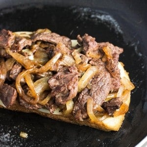 Some varieties of Philly cheesesteaks include peppers and/or mushrooms, but I stuck with only caramelized onions. Brian isn't a mushroom fan (I'm working on it), I'm not the biggest pepper fan (Brian's working on it), but we are both head over heels for caramelized onions so they were a no-brainer. By all means sauté them up too if you'd like to add them to the mix!
